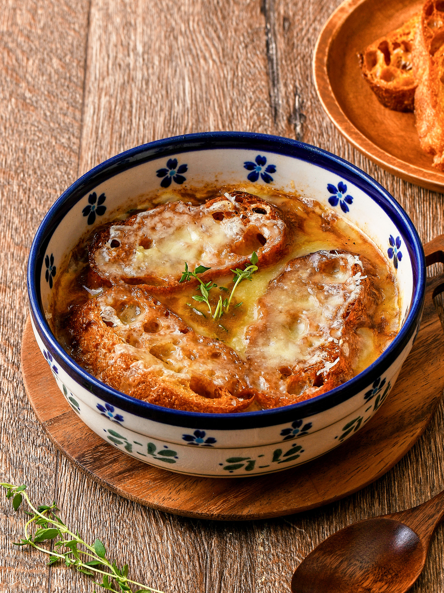飴色玉ねぎの甘みと、とろけるチーズの香ばしさ。心までじんわり温まる、冬のごちそうスープ 寒い季節になると無性に食べたくなる、オニオングラタンスープ。たっぷりの玉ねぎをじっくり炒めて甘みを引き出し、コク深いビーフストックで煮込んだスープに、カリッと焼いたパンととろけるチーズを重ねて。香ばしい香りに包まれながら、スプーンを入れる瞬間がたまらない、クラシックで贅沢なカフェの一皿です。 🛒 材料(2人分) ◾️ スープ オリーブオイル … 大さじ1.5(分けて使用) 無塩バター … 大さじ2 玉ねぎ(黄玉ねぎまた ...