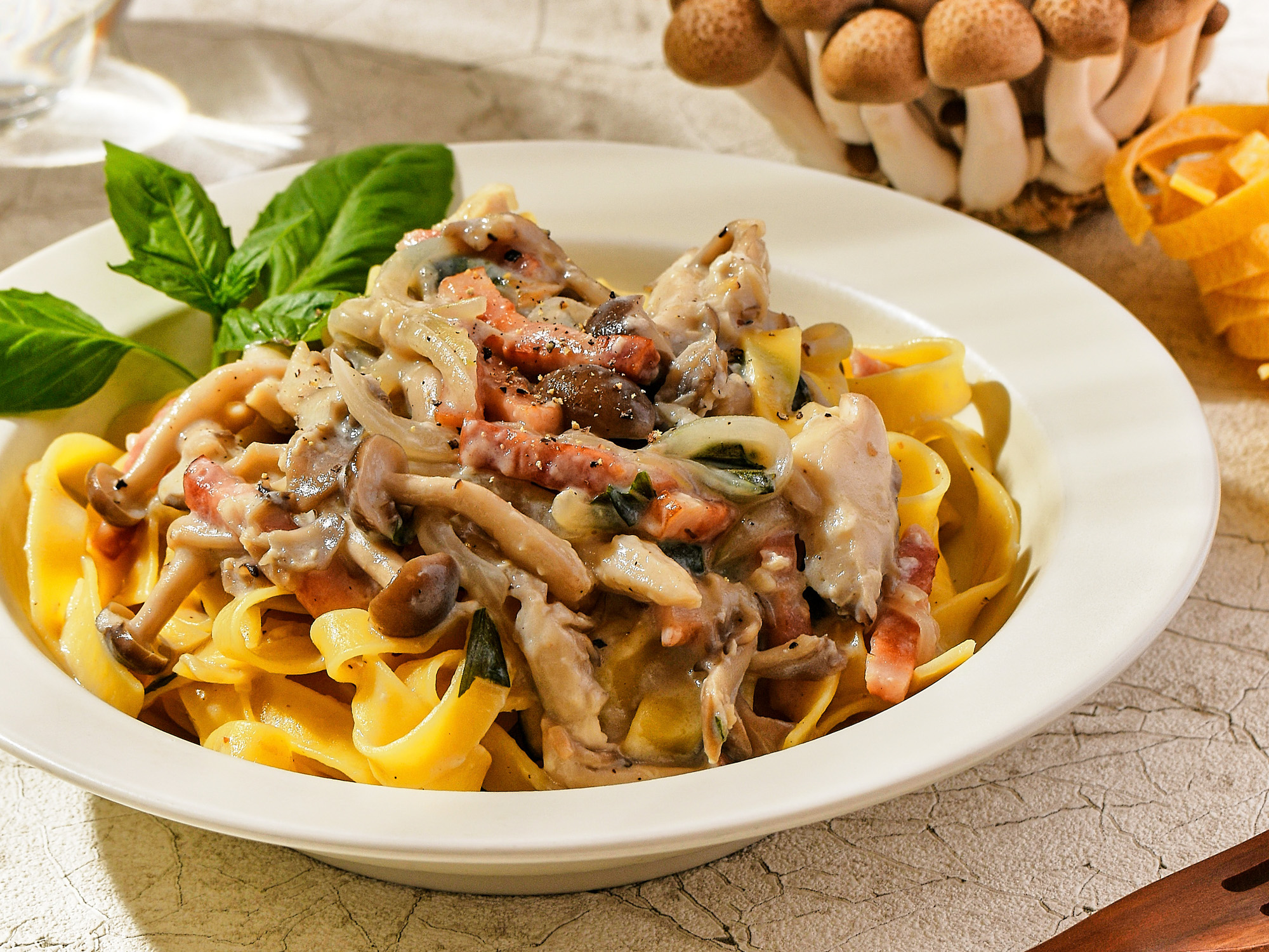きのこと塩糀ベーコンのカルボナーラ風フィットチーネ