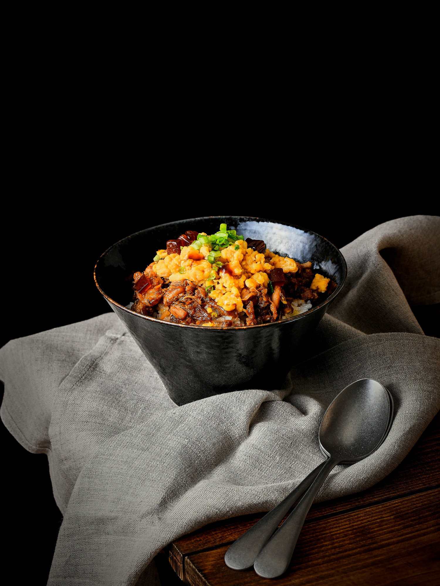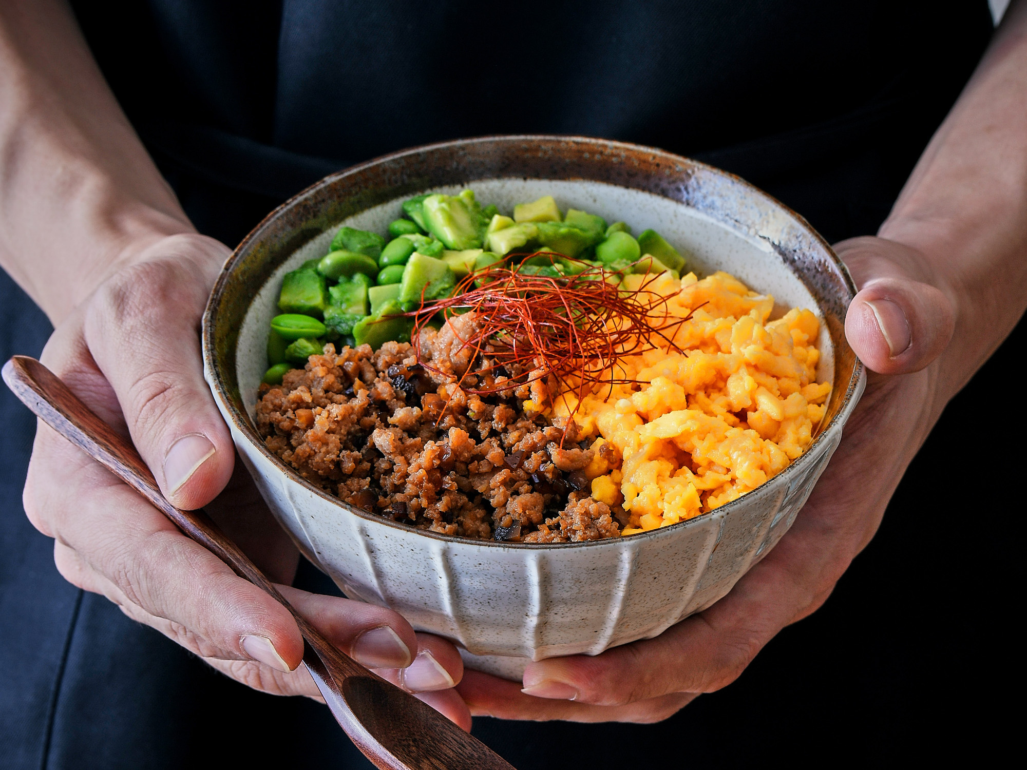 静かに重なる、三つの味の物語 ふだんの「三色丼」を、少しだけ特別に。鶏そぼろに干し椎茸の旨みを重ね、ふわふわの卵とクリーミーなアボカドで仕立てた、やさしい味わいの一杯です。仕上げに糸唐辛子をあしらえば、いつもの丼がぐっと洗練され、食卓に静かな高揚感をもたらしてくれます。 そぼろには戻し汁ごと加えた干し椎茸が深い香りとコクを添え、卵は生クリームを少し混ぜて、しっとりと口どけのよい仕上がりに。彩りの役割を担うのは青菜ではなく、やさしい甘みと滑らかさを持つアボカドと枝豆。味わいに変化をもたらしつつ、全体のバラン ...