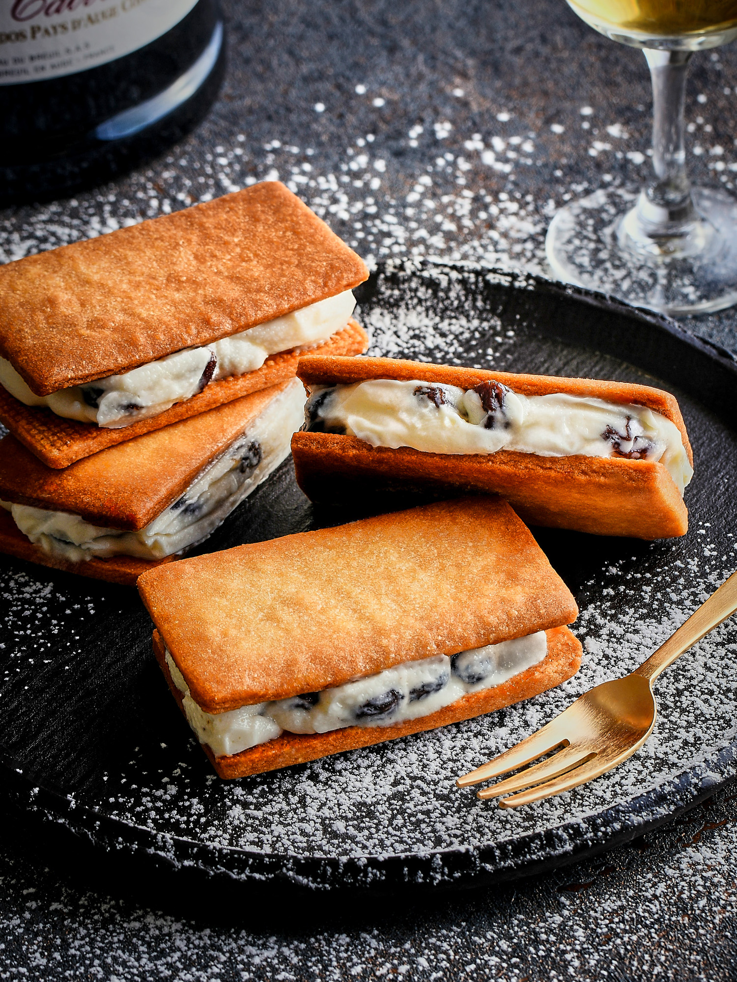 〜リンゴのブランデーが香る、とろける大人の半冷バターサンド〜 香ばしく焼き上げたサブレの間に、カルヴァドス(リンゴのブランデー)で香りづけしたレーズンと、ホワイトチョコのやわらかな甘みを閉じ込めて。 口に入れた瞬間、冷たさの中にふわりと広がるリンゴとバターの芳醇な香り。ひと息おくたびに、香りの余韻が少しずつ溶けていくようです。 冷やすことで、クリームはセミフレッドのようにふんわりとろけ、サブレのさくりとした食感と重なり合いながら、穏やかに、静かに、口の中で消えていきます。 粉糖を斜めに舞わせた黒いプレート ...