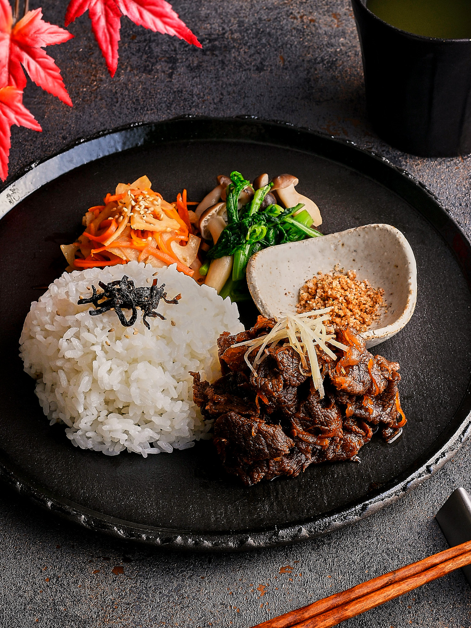 〜和の香りを灯す、穏やかなプレート〜 秋の午後。湯気とともに、やさしい生姜の香りがふわりと立ちのぼる。黒マットの器に映える艶やかな牛しぐれ煮は、光をまといながら、ひと口ごとに深まるような味わいです。 甘辛く煮た牛肉に、針生姜を添えて。副菜には、れんこんとにんじんのきんぴら、しめじと春菊のおひたし。小鉢の七味塩が香りを引き締め、白ごはんがそのやさしさをすべて包み込む──。 落ち着いたトーンの器に、彩りと香りで季節を描く、和モダンなプレートごはんです。 🥢 プレート構成(2人分) 主菜:牛しぐれ煮(針生姜添え ...