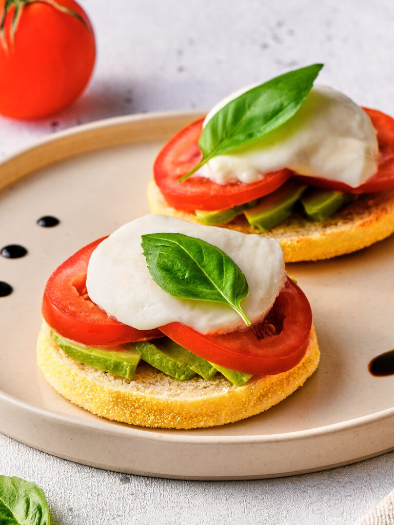 イングリッシュマフィンに、アボカド・トマト・モッツァレラを丁寧に重ねて。